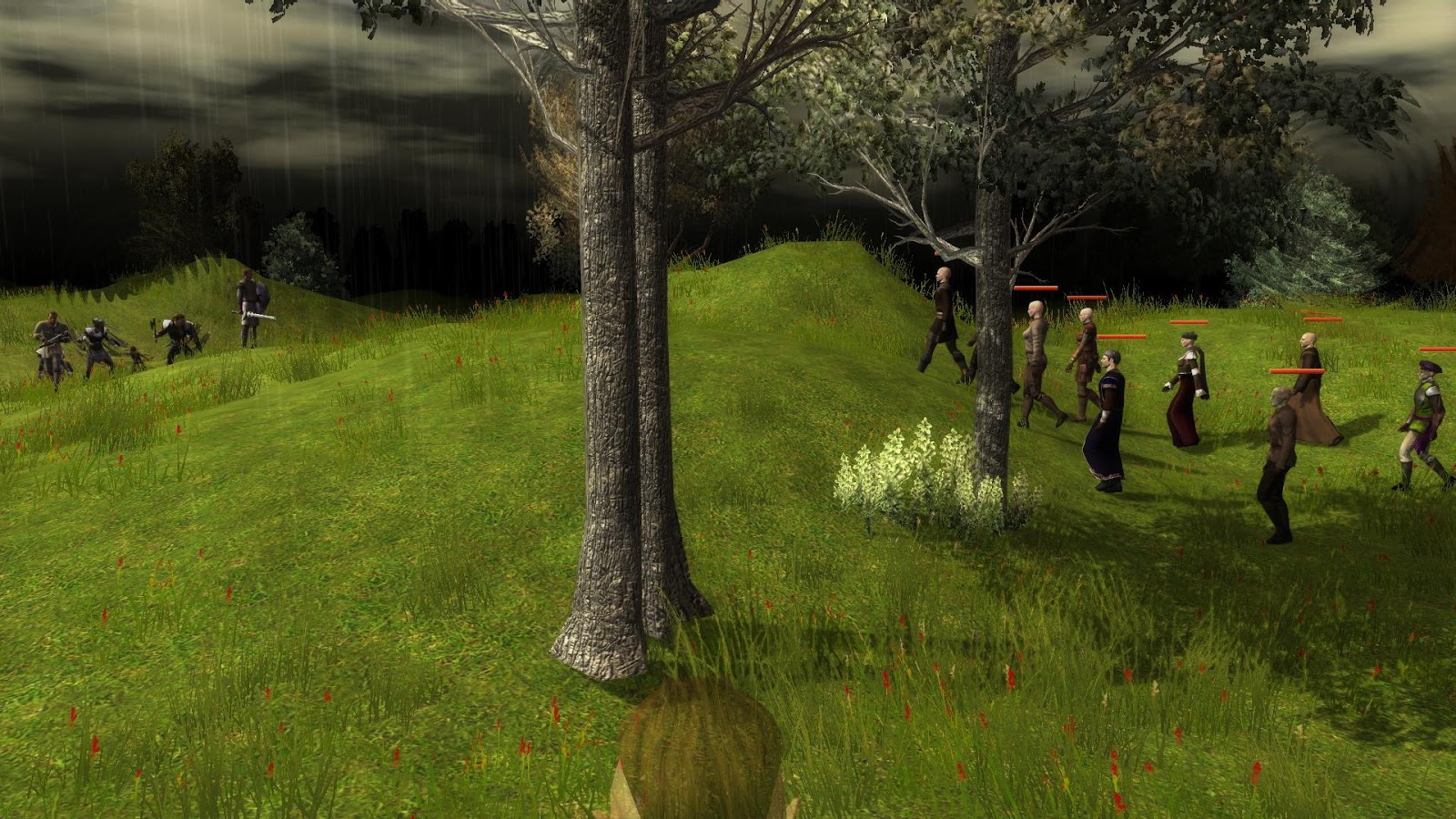 Helden led the party north and out of the village main, and further on towards the Shoreline road, the same road Vol have left them only a few days ago before they had come into the village. Continuing to follow the shore path and road, the heroes eventually reached the Red Guards who had camped along the road at the edge where the barrier prevented egress. After a quick chat with the Red Guard leader (who confirmed that Monty had not passed this way), and showing him their permit, the heroes quickly accepted the task of helping to keep unwelcome creatures away from the village by patrolling the grounds east of the lake and still within the barrier.